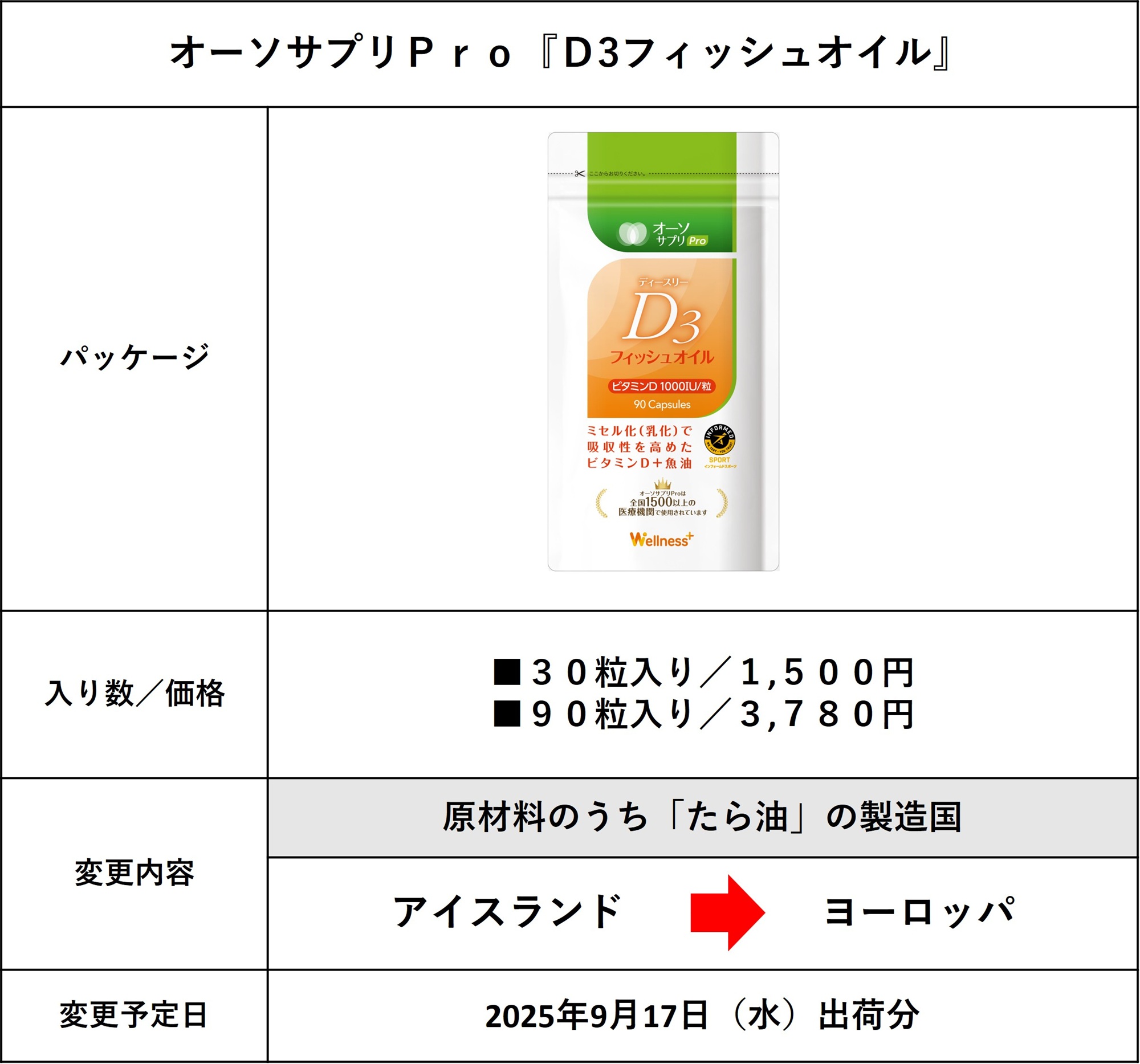 オーソサプリPro『D3フィッシュオイル』原材料の製造国変更につきましてご案内いたします。